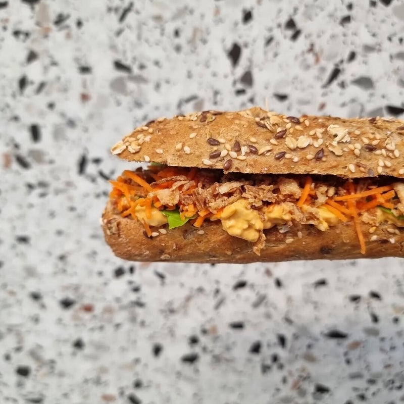 Broodje HALLOWEEN met licht pikante salade van varkensvlees, ajuin, paprika, maïs & pompoen met sla, wortel en gedroogde ui. €4,90 wit brood